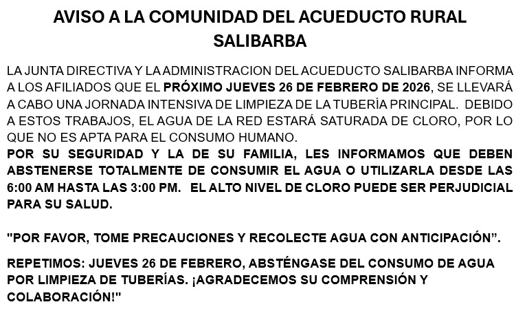 La Administración del Acueducto Salibarba informa que debido a una rotura en la tuberia causada por trabajos en la via, se suspendio el Servicio hasta la 3:00 p.m. mientras se drena la tuberia para poder realizar la reparacion. Agradecemos su compresión e Igualmente recordamos hacer uso de los tanques de reserva